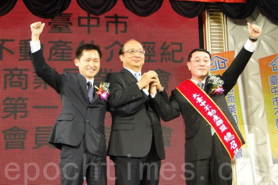 台中市長胡志強到場致詞,並為「大台中不動產聯盟」進行監交,左為前任總召黃昭閔、右為新任總召林金雄。