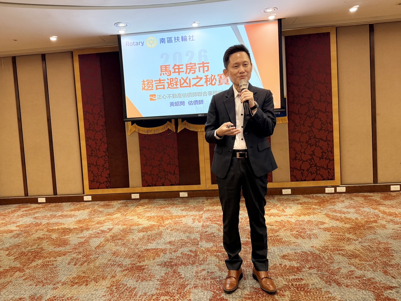 黃昭閔所長受邀至西南扶輪社演講,以「馬年房市趨吉避凶之秘寶」為題,淺談臺中人口與量體分析,藉由了解經濟、薪資、通膨等方面,進一步引領講座參與者了解房市趨勢。