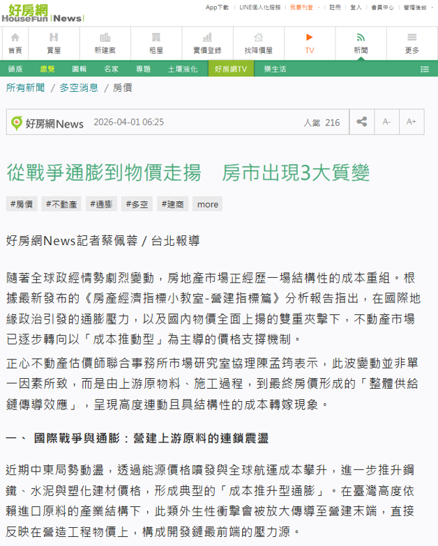 近期中東局勢動盪,透過能源價格噴發與全球航運成本攀升,進一步推升鋼鐵、水泥與塑化建材價格,形成典型的「成本推升型通膨」。在臺灣高度依賴進口原料的產業結構下,此類外生性衝擊會被放大傳導至營建末端,直接反映在營造工程物價上,構成開發鏈最前端的壓力源。