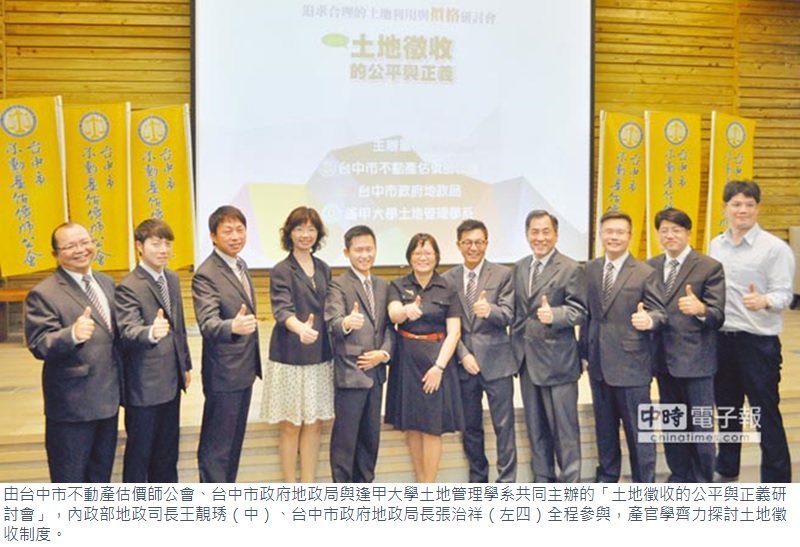 由台中市不動產估價師公會、台中市政府地政局與逢甲大學土地管理學系共同主辦的「土地徵收的公平與正義研討會」,17日假逢甲大學盛大舉行。內政部地政司長王靚琇、台中市政府地政局長張治祥與逢甲大學土管系主任陳建元全程參與,產官學齊力探討土地徵收制度。