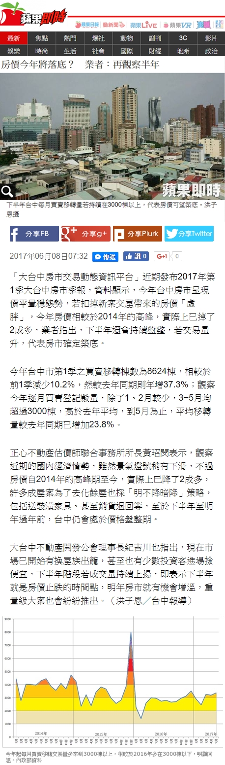「大台中房市交易動態資訊平台」近期發布2017年第1季大台中房市季報,資料顯示,今年台中房市呈現價平量穩態勢,若扣掉新案交屋帶來的房價「虛胖」,今年房價相較於2014年的高峰,實際上已掉了2成多,業者指出,下半年還會持續盤整,若交易量升,代表房市確定築底。