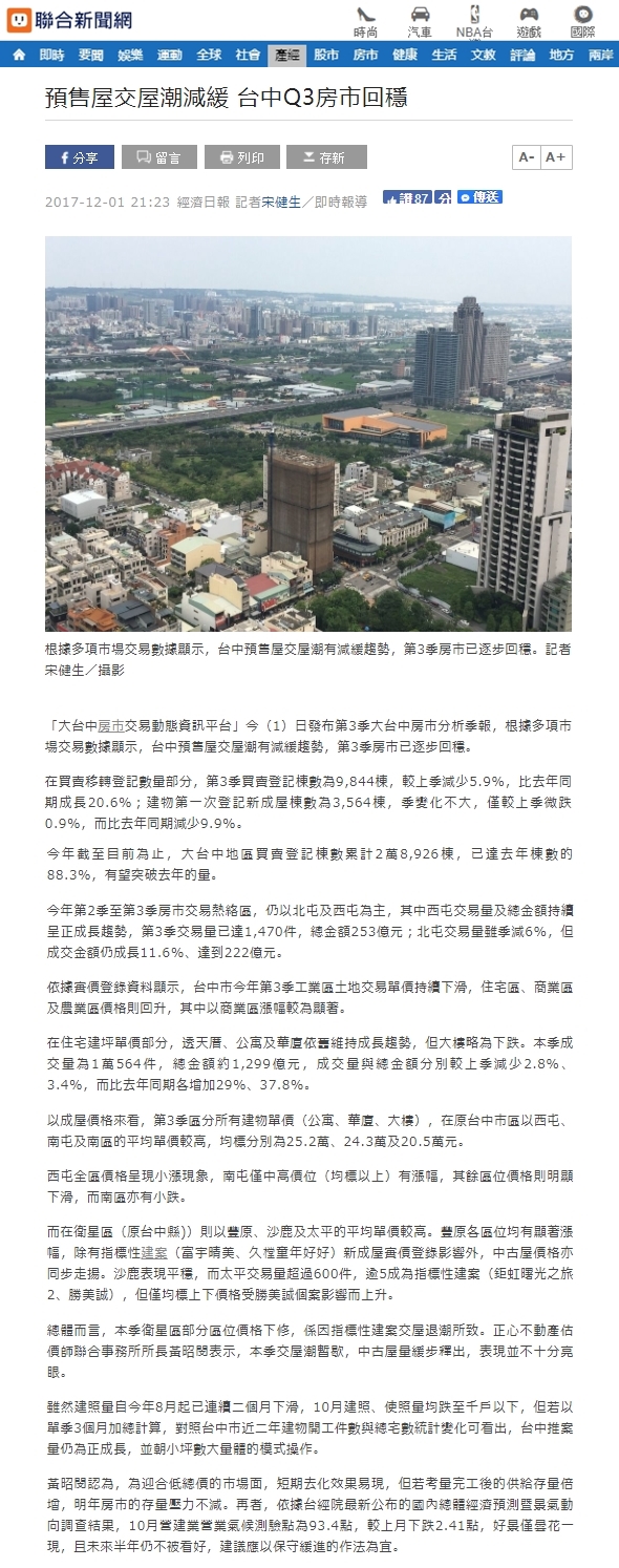 「大台中房市交易動態資訊平台」今(1)日發布第3季大台中房市分析季報,根據多項市場交易數據顯示,台中預售屋交屋潮有減緩趨勢,第3季房市已逐步回穩。