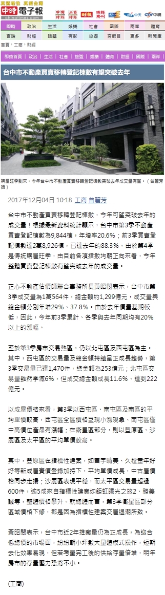 正心不動產估價師聯合事務所長黃昭閔表示,台中市第3季成交量為1萬564件,總金額約1,299億元,成交量與總金額分別年增29%、37.8%。由於去年價量基期較低,因此,今年前3季累計、各季與去年同期均有20%以上的漲幅。