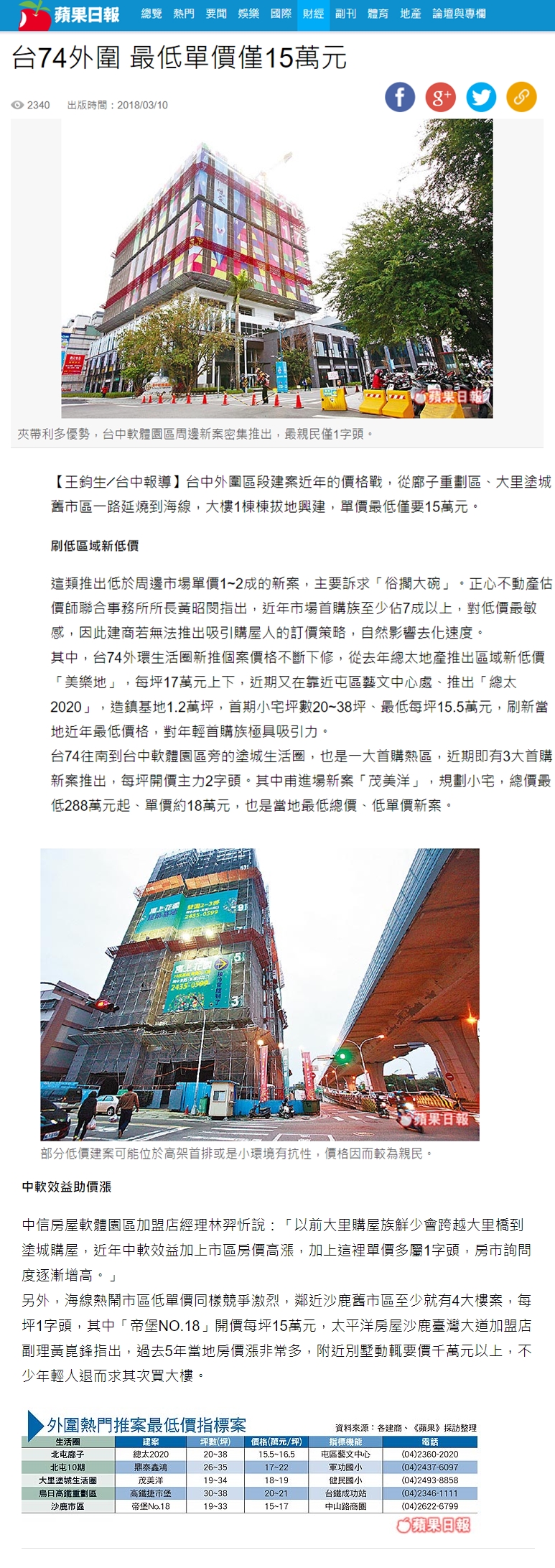 台74往南到台中軟體園區旁的塗城生活圈,也是一大首購熱區,近期即有3大首購新案推出,每坪開價主力2字頭。其中甫進場新案「茂美洋」,規劃小宅,總價最低288萬元起、單價約18萬元,也是當地最低總價、低單價新案。