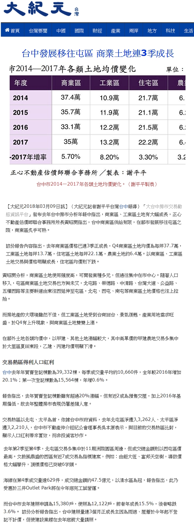 「大台中房市交易動態資訊平台」發布去年台中房市分析年報中指出,商業區、工業區土地有大幅成長,正心不動產估價師聯合事務所所長黃昭閔指出,台中商業區供給有限,在都市發展移往屯區之際,商業區炙手可熱。