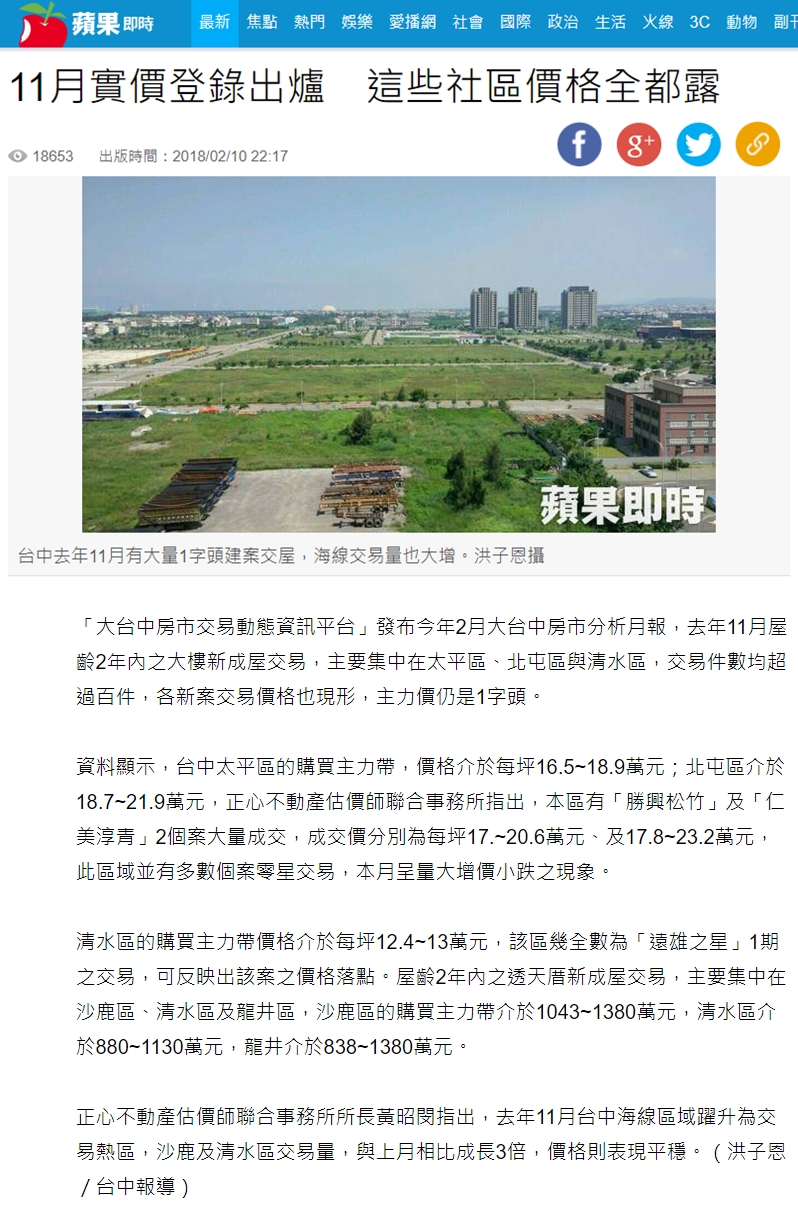 「大台中房市交易動態資訊平台」發布今年2月大台中房市分析月報,去年11月屋齡2年內之大樓新成屋交易,主要集中在太平區、北屯區與清水區,交易件數均超過百件,各新案交易價格也現形,主力價仍是1字頭。