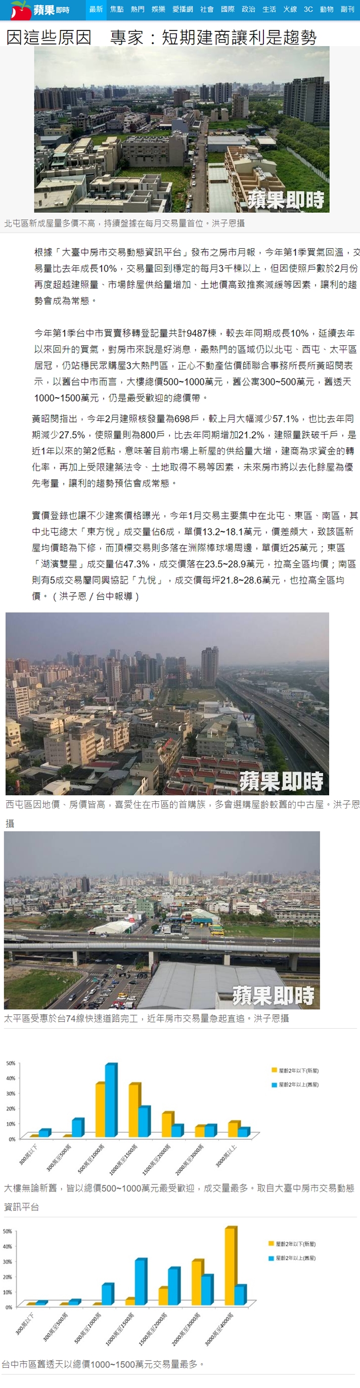 今年第1季台中市買賣移轉登記量共計9487棟,較去年同期成長10%,延續去年以來回升的買氣,對房市來說是好消息,最熱門的區域仍以北屯、西屯、太平區居冠,仍站穩民眾購屋3大熱門區,正心不動產估價師聯合事務所長所黃昭閔表示,以舊台中市而言,大樓總價500~1000萬元,舊公寓300~500萬元,舊透天1000~1500萬元,仍是最受歡迎的總價帶。