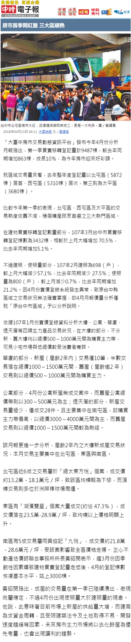 「大臺中房市交易動態資訊平台」發布今年4月份分析月報指出,第一季買賣移轉登記量計9487棟,較去年同期增加863棟,成長10%,為今年房市迎來好彩頭。