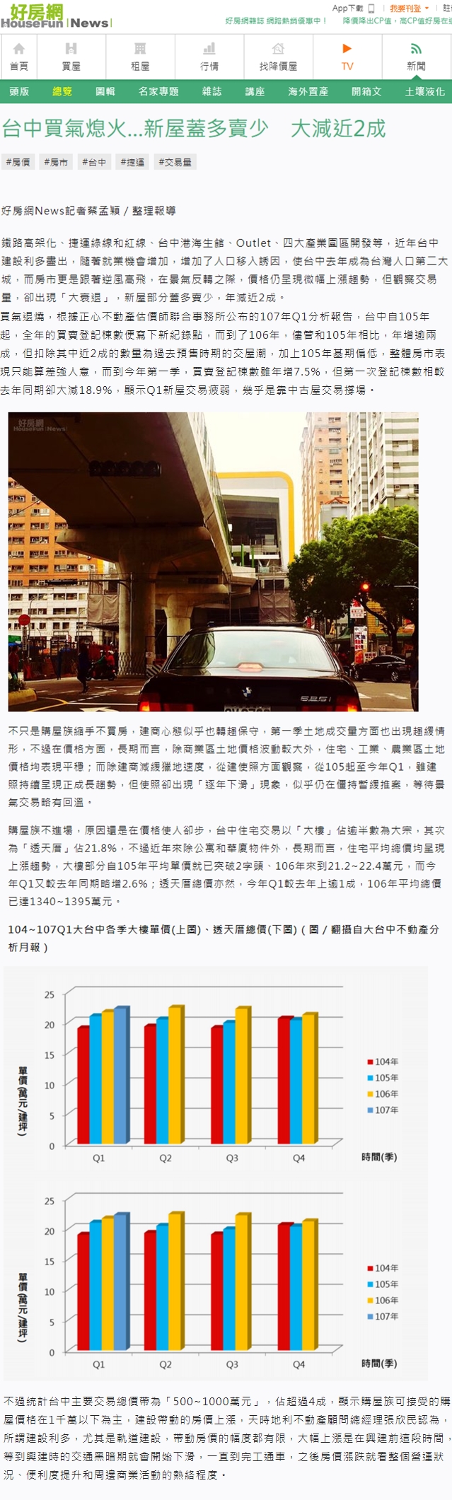 買氣退燒,根據正心不動產估價師聯合事務所公布的107年Q1分析報告,台中自105年起,全年的買賣登記棟數便寫下新紀錄點,而到了106年,儘管和105年相比,年增逾兩成,但扣除其中近2成的數量為過去預售時期的交屋潮,加上105年基期偏低,整體房市表現只能算差強人意,而到今年第一季,買賣登記棟數雖年增7.5%,但第一次登記棟數相較去年同期卻大減18.9%,顯示Q1新屋交易疲弱,幾乎是靠中古屋交易撐場。
