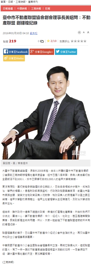 中華民國不動產仲介公會全國聯合會理事長林正雄,再將它發揚光大,這把聯盟的香火,有了一年一度的不動產高峰論壇這樣盛大活動的加持,一定會綿延不絕,讓大臺中房地產的天空,更加美麗燦爛。