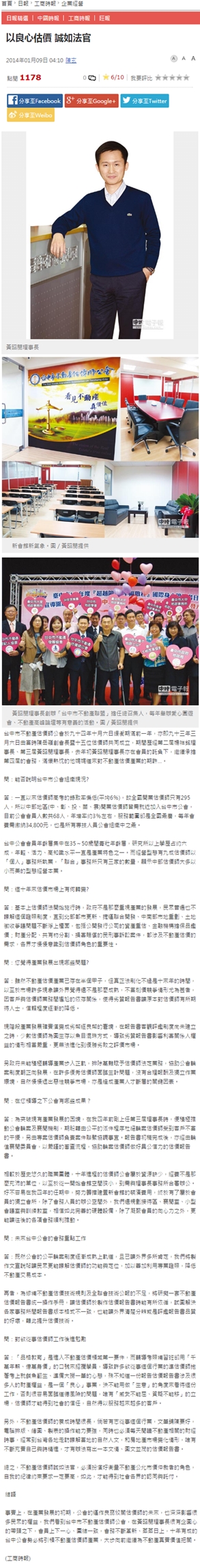 答:為突破現有產業發展的困境,在我四年前剛上任第三屆理事長時,便積極推動公會輪案及襄閱機制,期盼藉由公平的派件程序杜絕輪案估價師受到客戶不當的干擾,另由專案估價師負責案件聯繫協調事宜。報告書初稿完成後,亦經由輪值襄閱委員會,以嚴謹的審查流程,協助輪案估價師做好具公信力的估價報告書。