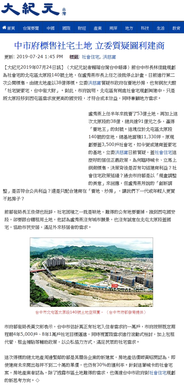 盧秀燕上任半年來就賣了53億土地,再加上這次太原段的38億,總共達91億元之多,贏得「賣地王」的封號。這塊位於北屯區太原段140號的空地,總基地面積11,330坪,原規劃要蓋3,500戶社會宅,如今變成建商蓋豪宅的基地,立委洪慈庸日前質疑,蓋社會住宅這麼好的居住正義政策,為何臨時喊卡、立馬上網做標售,決策背後是否有勾結建商利益?社會住宅政策延續?過去市府都是以「規畫調整的美意」來回應,但盧秀燕所說的「創新調整」是否符合公共利益?還是只配合建商在「賣地、炒房」,讓我們下一代或年輕人更買不起房子?
