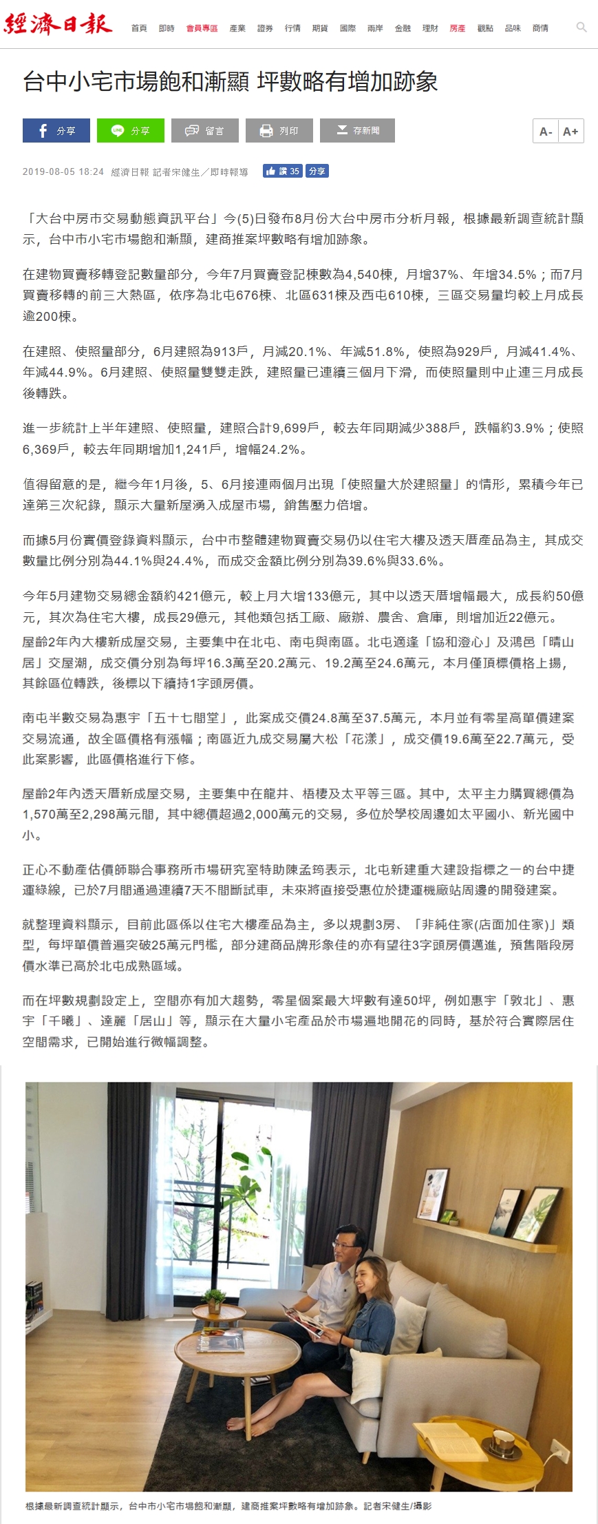 「大台中房市交易動態資訊平台」今(5)日發布8月份大台中房市分析月報,根據最新調查統計顯示,台中市小宅市場飽和漸顯,建商推案坪數略有增加跡象。