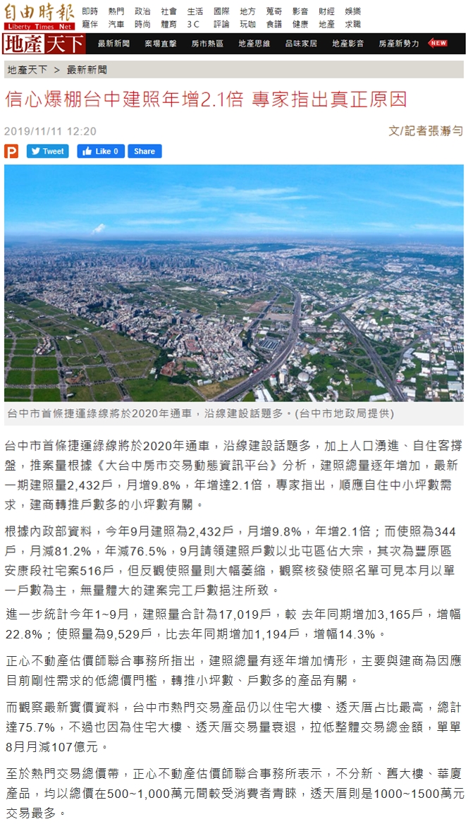 台中市首條捷運綠線將於2020年通車,沿線建設話題多,加上人口湧進、自住客撐盤,推案量根據《大台中房市交易動態資訊平台》分析,建照總量逐年增加,最新一期建照量2,432戶,月增9.8%,年增達2.1倍,專家指出,順應自住中小坪數需求,建商轉推戶數多的小坪數有關。