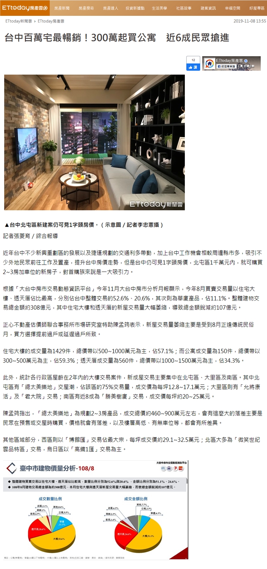 根據「大台中房市交易動態資訊平台」今年11月大台中房市分析月報顯示,今年8月買賣交易量以住宅大樓、透天厝佔比最高,分別佔台中整體交易的52.6%、20.6%,其次則為華廈產品,佔11.1%。整體建物交易總金額約308億元,其中住宅大樓和透天厝的新屋交易量大幅萎縮,導致總金額銳減約107億元。