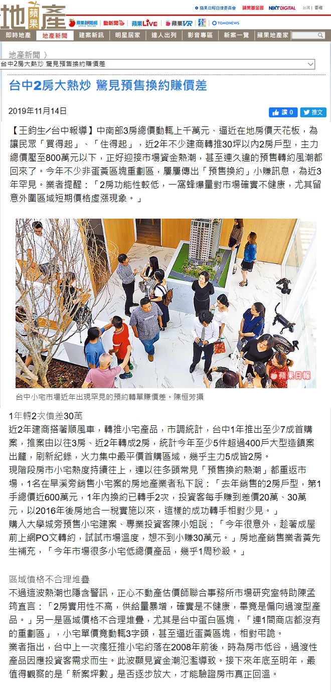 購入大學城旁預售小宅建案、專業投資客陳小姐說:「今年很意外,趁著成屋前上網PO文轉約,試試市場溫度,想不到小賺30萬元。」房地產銷售業者黃先生補充,「今年市場很多小宅低總價產品,幾乎1周秒殺。」