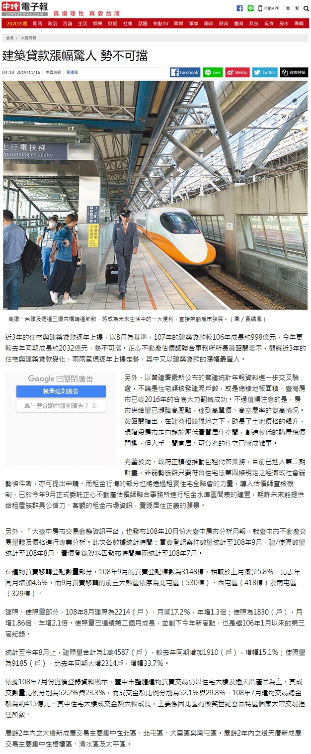 另外,「大臺中房市交易動態資訊平台」也發布108年10月份大臺中房市分析月報,就臺中市不動產交易量體及價格進行專業分析。此次各數據統計時間:買賣登記案件數量統計至108年9月、建/使照數量統計至108年8月、實價登錄資料因發布時間差而統計至108年7月。