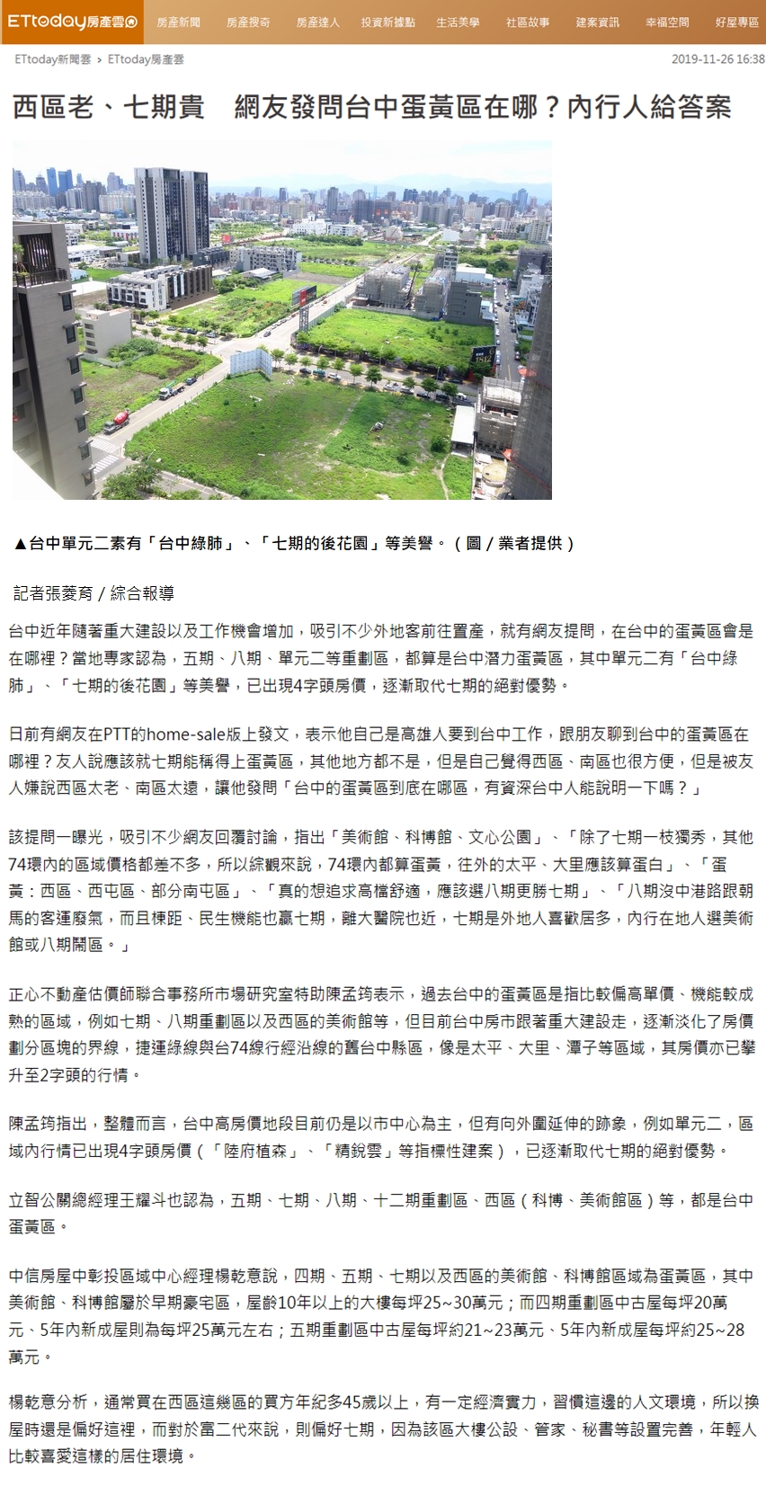 台中近年隨著重大建設以及工作機會增加,吸引不少外地客前往置產,就有網友提問,在台中的蛋黃區會是在哪裡?當地專家認為,五期、八期、單元二等重劃區,都算是台中潛力蛋黃區,其中單元二有「台中綠肺」、「七期的後花園」等美譽,已出現4字頭房價,逐漸取代七期的絕對優勢。