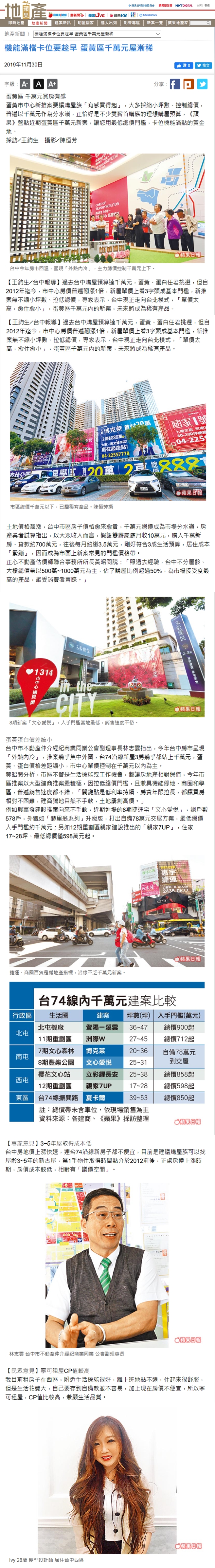 台中市不動產仲介經紀商業同業公會副理事長林志雲指出,今年台中房市呈現「外熱內冷」,推案幾乎集中外圍,台74沿線新屋3房幾乎都站上千萬元,蛋黃、蛋白價格差距縮小,市中心單價控制在千萬元以內為主。