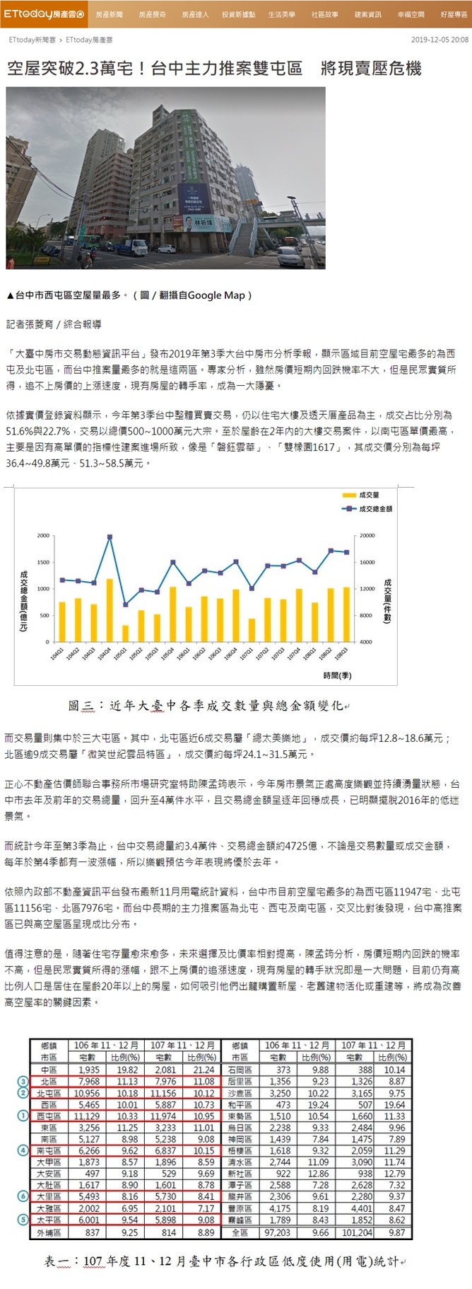 「大臺中房市交易動態資訊平台」發布2019年第3季大台中房市分析季報,顯示區域目前空屋宅最多的為西屯及北屯區,而台中推案量最多的就是這兩區。專家分析,雖然房價短期內回跌機率不大,但是民眾實質所得,追不上房價的上漲速度,現有房屋的轉手率,成為一大隱憂。