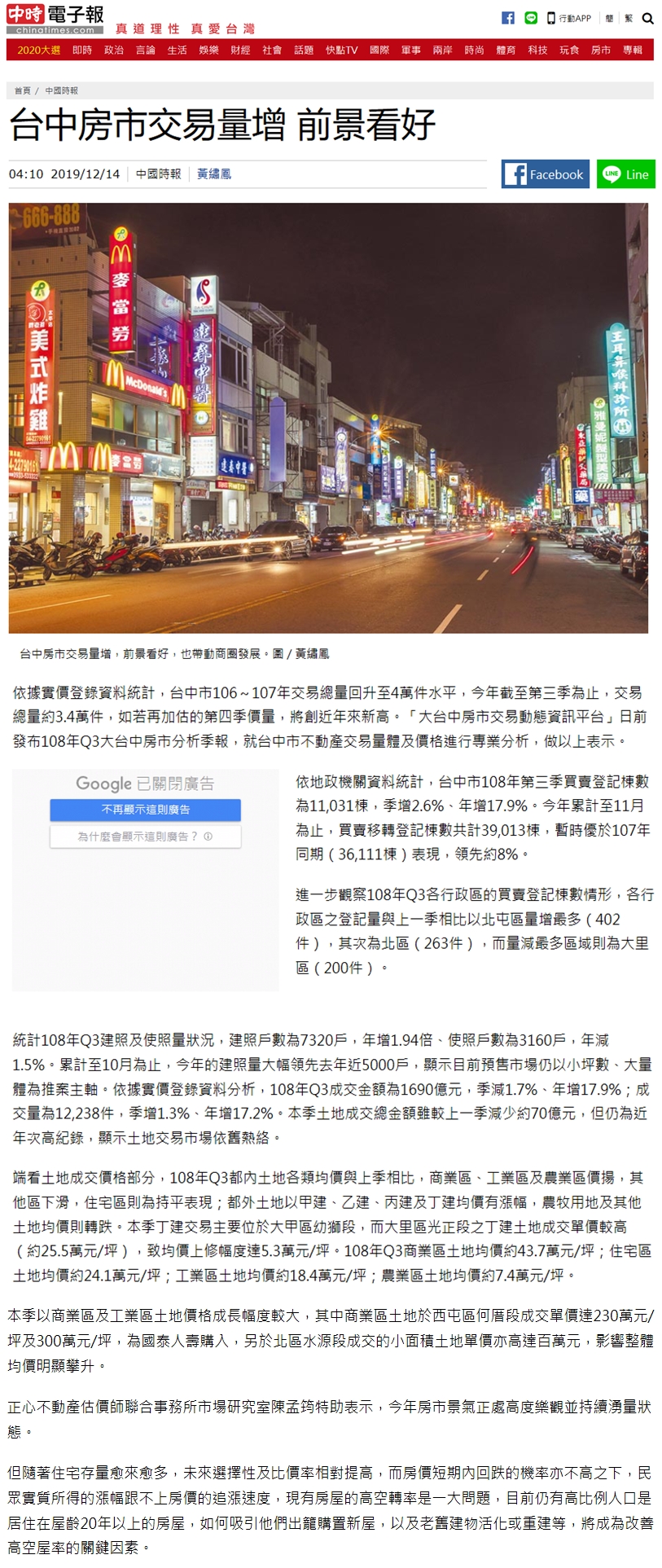 據實價登錄資料統計,台中市106~107年交易總量回升至4萬件水平,今年截至第三季為止,交易總量約3.4萬件,如若再加估的第四季價量,將創近年來新高。「大台中房市交易動態資訊平台」日前發布108年Q3大台中房市分析季報,就台中市不動產交易量體及價格進行專業分析,做以上表示。