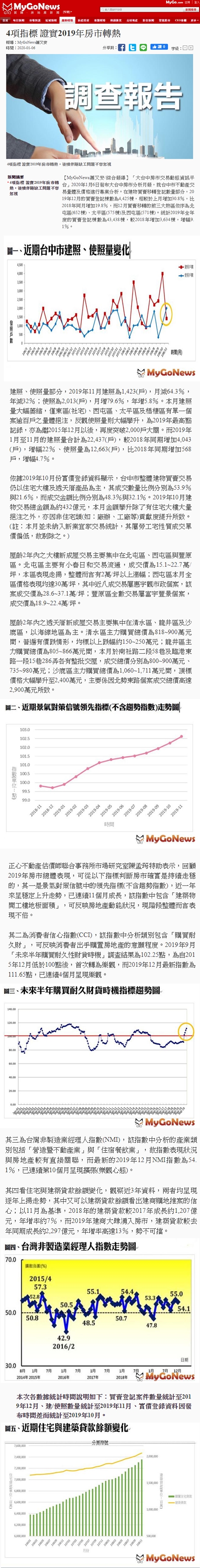 其二為消費者信心指數(CCI),該指數中分析類別包含「購買耐久財」,可反映消費者出手購置房地產的意願程度。2019年9月「未來半年購買耐久性財貨時機」調查結果為102.25點,為自2015年12月低於100點後,首次轉為樂觀,而2019年12月最新指數為111.65點,已連續4個月呈現樂觀。