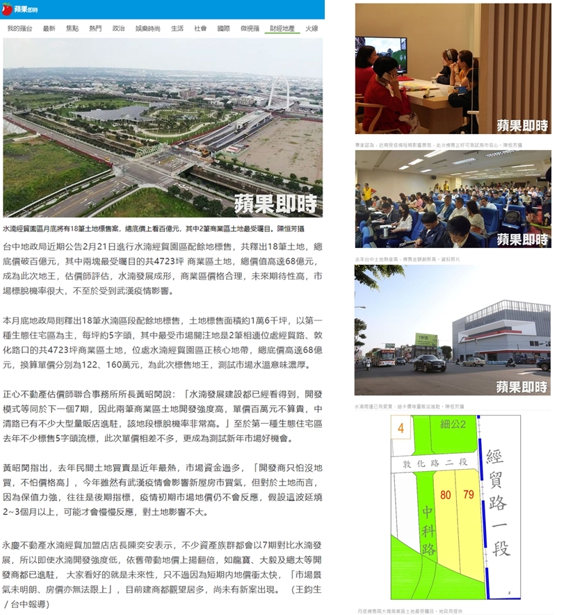 台中地政局近期公告2月21日進行水湳經貿園區配餘地標售,共釋出18筆土地,總底價破百億元,其中兩塊最受矚目的共4723坪 商業區土地,總價值高達68億元,成為此次地王,估價師評估,水湳發展成形,商業區價格合理,未來期待性高,市場標脫機率很大,不至於受到武漢疫情影響。