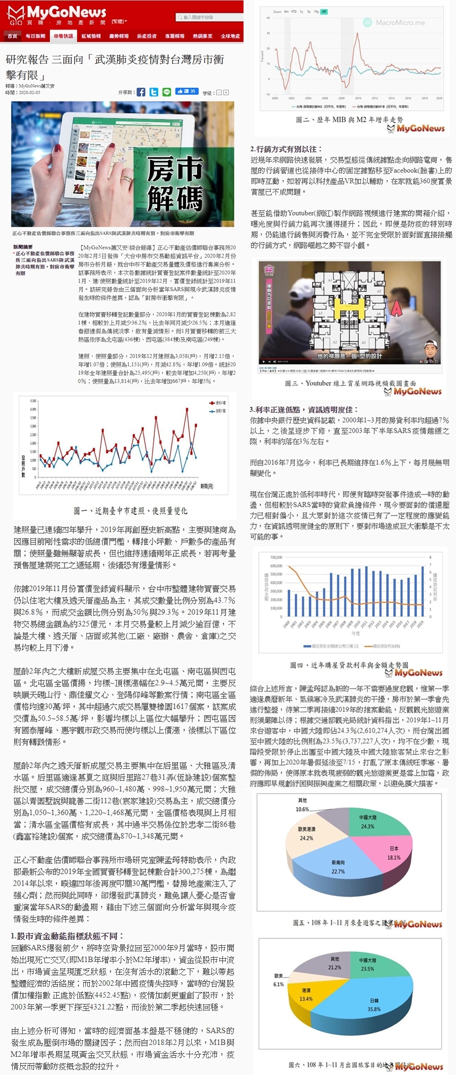 正心不動產估價師聯合事務所2020年2月5日發佈「大台中房市交易動態資訊平台」2020年2月份房市分析月報,就台中市不動產交易量體及價格進行專業分析。該事務所表示,本次各數據統計買賣登記案件數量統計至2020年1月、建/使照數量統計至2019年12月、實價登錄統計至2019年11月。該研究報告由三個面向分析當年SARS與現今武漢肺炎疫情發生時的條件差異,認為「對房市衝擊有限」。