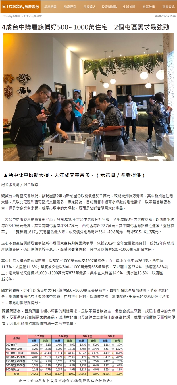 台中房產交易狀況,發現屋齡2年內新成屋仍以總價低於千萬元,較能受到買方青睞,其中新成屋住宅大樓,又以北屯區和西屯區成交量最多。專家認為,目前預售市場有小坪數的剛性需求,以年輕首購族為主,但是對企業主來說,成屋市場中的大坪數,反而是貼近實際需求的產品。