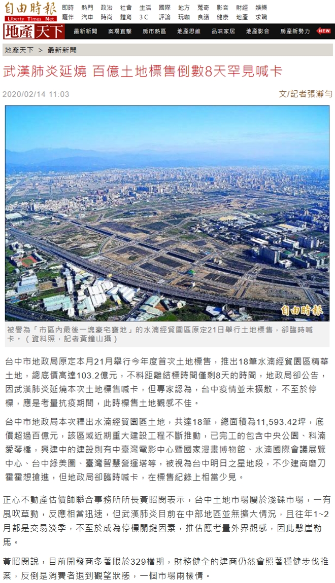 台中市地政局原定本月21月舉行今年度首次土地標售,推出18筆水湳經貿園區精華土地,總底價高達103.2億元,不料距離結標時間僅剩8天的時間,地政局卻公告,因武漢肺炎延燒本次土地標售喊卡,但專家認為,台中疫情並未擴散,不至於停標,應是考量抗疫期間,此時標售土地觀感不佳。
