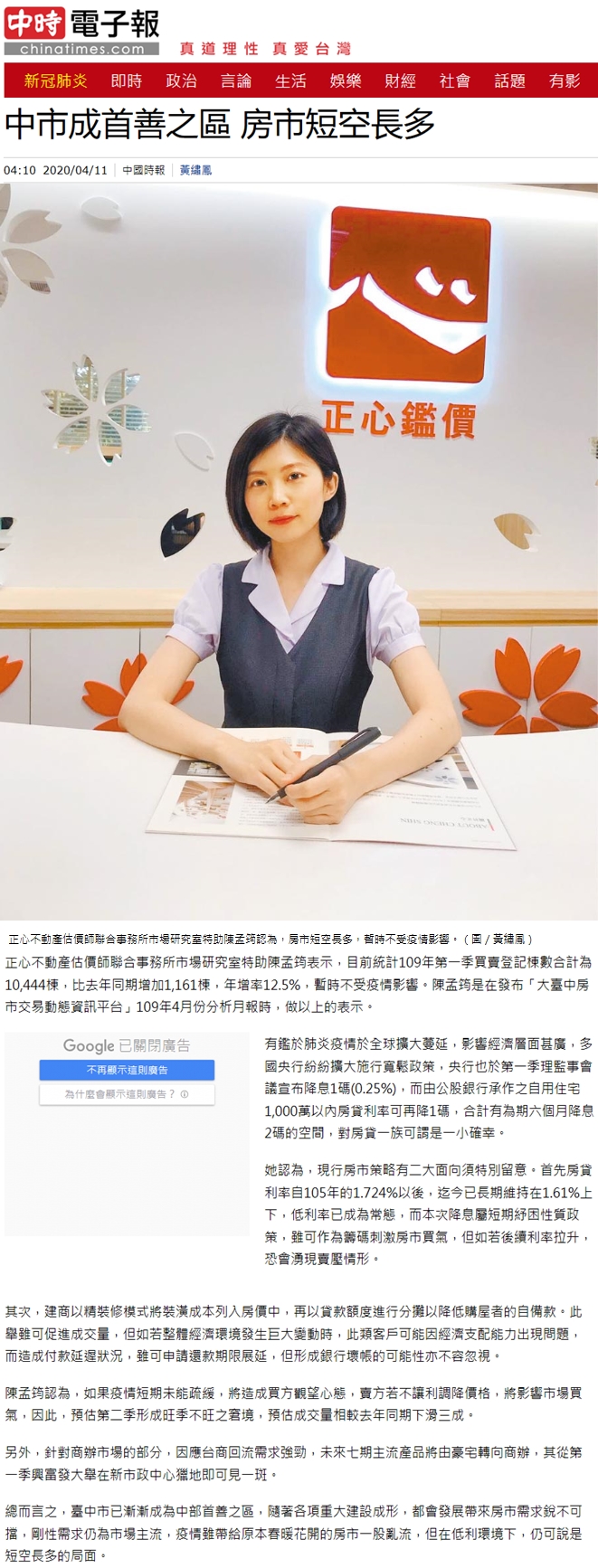 正心不動產估價師聯合事務所市場研究室特助陳孟筠表示,目前統計109年第一季買賣登記棟數合計為10,444棟,比去年同期增加1,161棟,年增率12.5%,暫時不受疫情影響。陳孟筠是在發布「大臺中房市交易動態資訊平台」109年4月份分析月報時,做以上的表示。