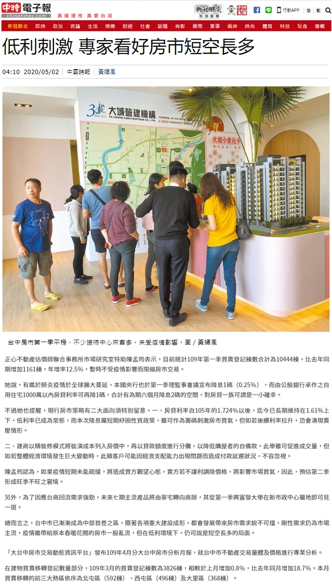 「大台中房市交易動態資訊平台」發布109年4月分大台中房市分析月報,就台中市不動產交易量體及價格進行專業分析。