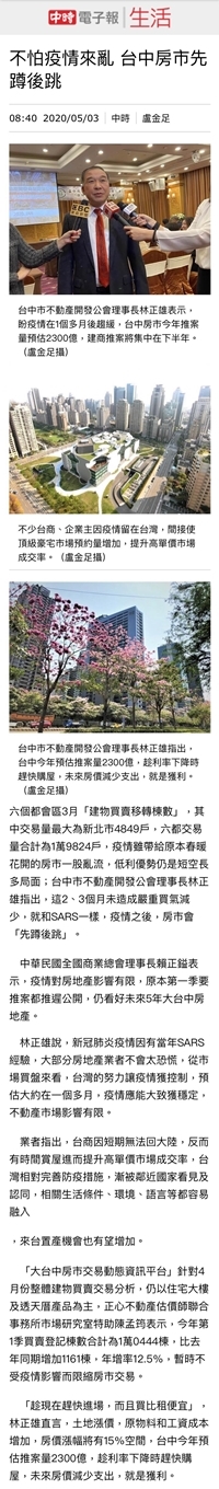 林正雄說,新冠肺炎疫情因有當年SARS經驗,大部分房地產業者不會太恐慌,從市場買盤來看,台灣的努力讓疫情獲控制,預估大約在一個多月,疫情應能大致獲穩定,不動產市場影響有限。