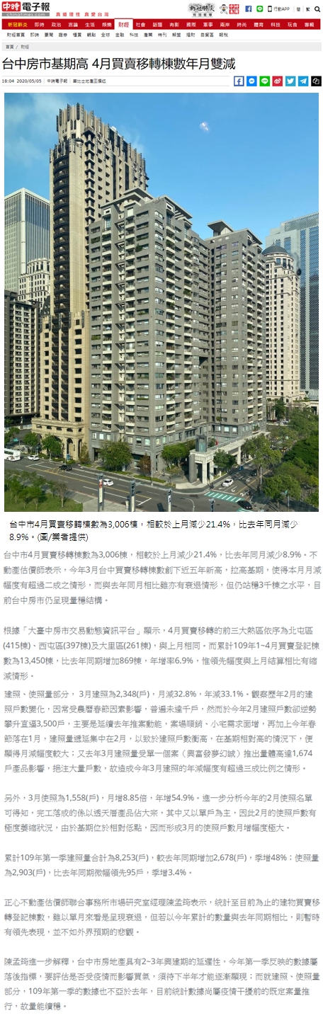 陳孟筠進一步解釋,台中市房地產具有2~3年興建期的延遲性,今年第一季反映的數據屬落後指標,要評估是否受疫情而影響買氣,須待下半年才能逐漸顯現;而就建照、使照量部分,109年第一季的數據也不亞於去年,目前統計數據尚屬疫情干擾前的既定案量推行,故量能續穩。