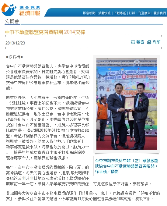 每年,台中市不動產聯盟的重頭戲,除了夏天的高峰論壇、冬天的愛心園遊會,還穿插秋天的球賽聯誼及11月11日地政節慶祝活動;聯盟總召任期原訂一年一屆,未料大家年年要求黃昭閔續任,可見這個位子不好坐,事務繁多。