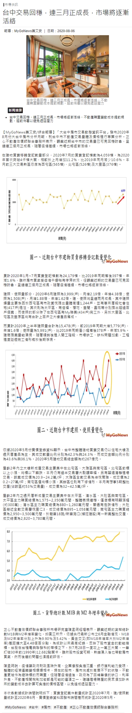 「大台中房市交易動態資訊平台」發布2020年8月份大台中房市分析月報,就台中市不動產交易量體及價格進行專業分析。正心不動產估價師聯合事務所表示,觀察近期台中市的交易量已可見回穩跡象,呈連續三個月正成長,隨著疫情趨緩,市場也將逐漸活絡。