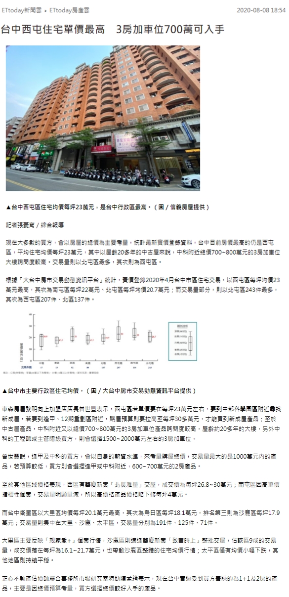 東森房屋黎明向上加盟店店長曾世豐表示,西屯區若單價要在每坪23萬元左右,要到中部科學園區附近尋找新成屋,若要到逢甲、12期重劃區附近,購屋預算則要拉高至每坪30多萬元,才能買到新成屋產品;至於中古屋產品,中科附近又以總價700~800萬元的3房加車位產品詢問度較高,屋齡約20多年的大樓,另外中科的工程師或主管階級買方,則會選擇1500~2000萬元左右的3房加車位。