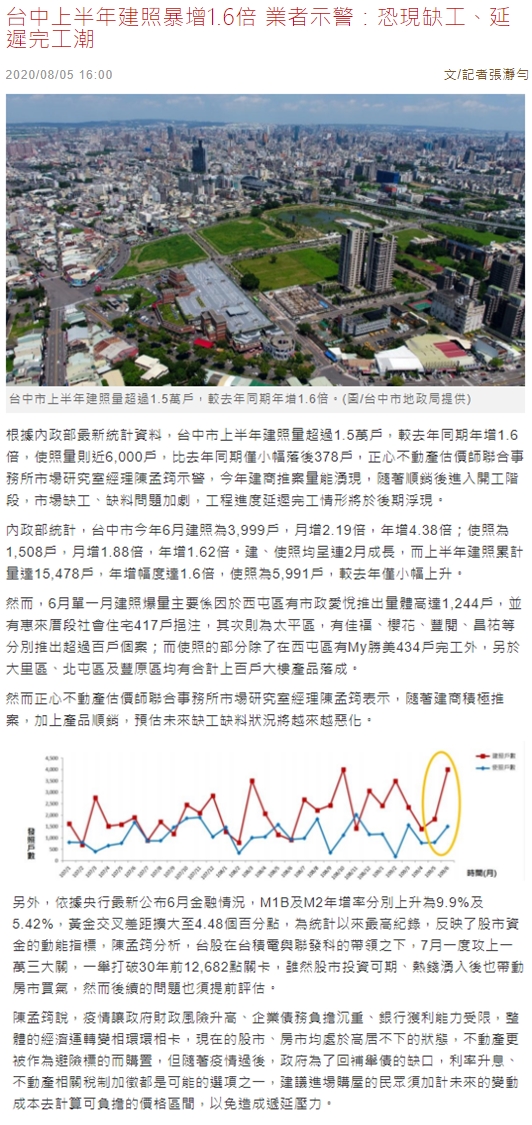 根據內政部最新統計資料,台中市上半年建照量超過1.5萬戶,較去年同期年增1.6倍,使照量則近6,000戶,比去年同期僅小幅落後378戶,正心不動產估價師聯合事務所市場研究室經理陳孟筠示警,今年建商推案量能湧現,隨著順銷後進入開工階段,市場缺工、缺料問題加劇,工程進度延遲完工情形將於後期浮現。