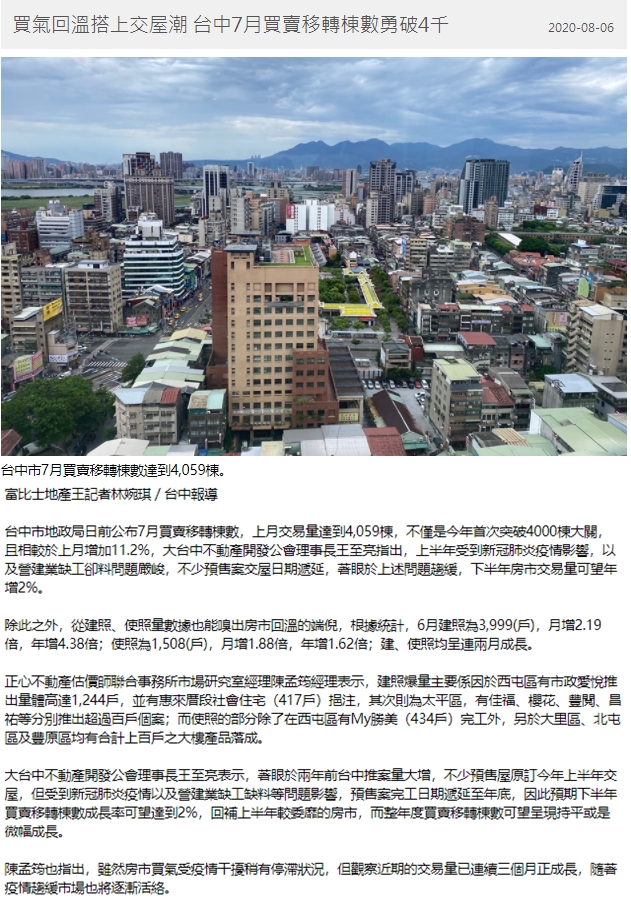 台中市地政局日前公布7月買賣移轉棟數,上月交易量達到4,059棟,不僅是今年首次突破4000棟大關,且相較於上月增加11.2%,大台中不動產開發公會理事長王至亮指出,上半年受到新冠肺炎疫情影響,以及營建業缺工卻料問題嚴峻,不少預售案交屋日期遞延,著眼於上述問題趨緩,下半年房市交易量可望年增2%。