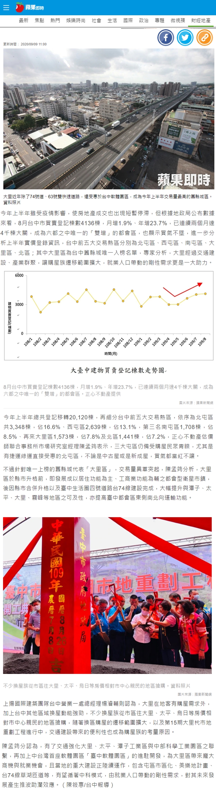 今年上半年雖受疫情影響,使房地產成交也出現短暫停滯,但根據地政局公布數據來看,8月台中市買賣登記棟數4136棟,月增1.9%、年增23.7%,已連續兩個月達4千棟大關,成為六都之中唯一的「雙增」的都會區,也顯示買氣不墜,進一步分析上半年實價登錄資訊,台中前五大交易熱區分別為北屯區、西屯區、南屯區、大里區、北區;其中大里區為台中舊縣城唯一入榜名單,專家分析,大里經過交通建設、產業群聚,讓購屋族遷移範圍擴大,就業人口帶動的剛性需求更是一大助力。