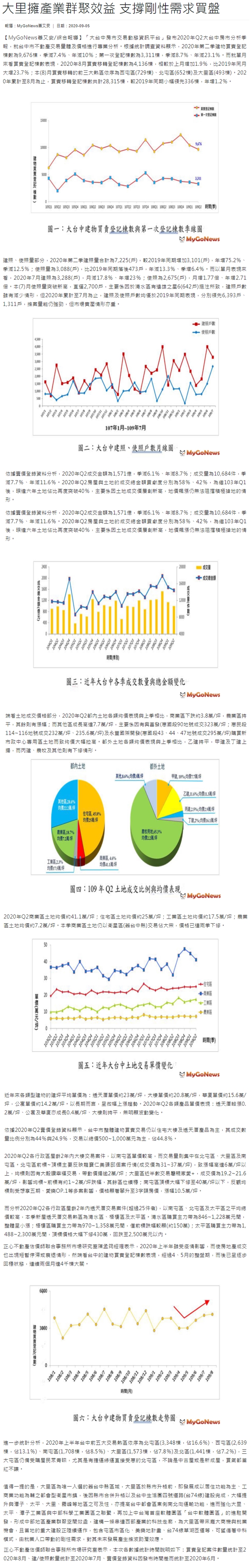 依據實價登錄資料分析,2020年Q2成交金額為1,571億,季減6.1%、年減8.7%;成交量為10,684件,季減7.7%、年減11.6%。2020年Q2房屋與土地的成交總金額貢獻度分別為58%、42%,為繼103年Q1後,暌違六年土地佔比再度突破40%,主要係因土地成交價屢創新高,地價飆漲仍無法阻擋積極搶地的情形。
