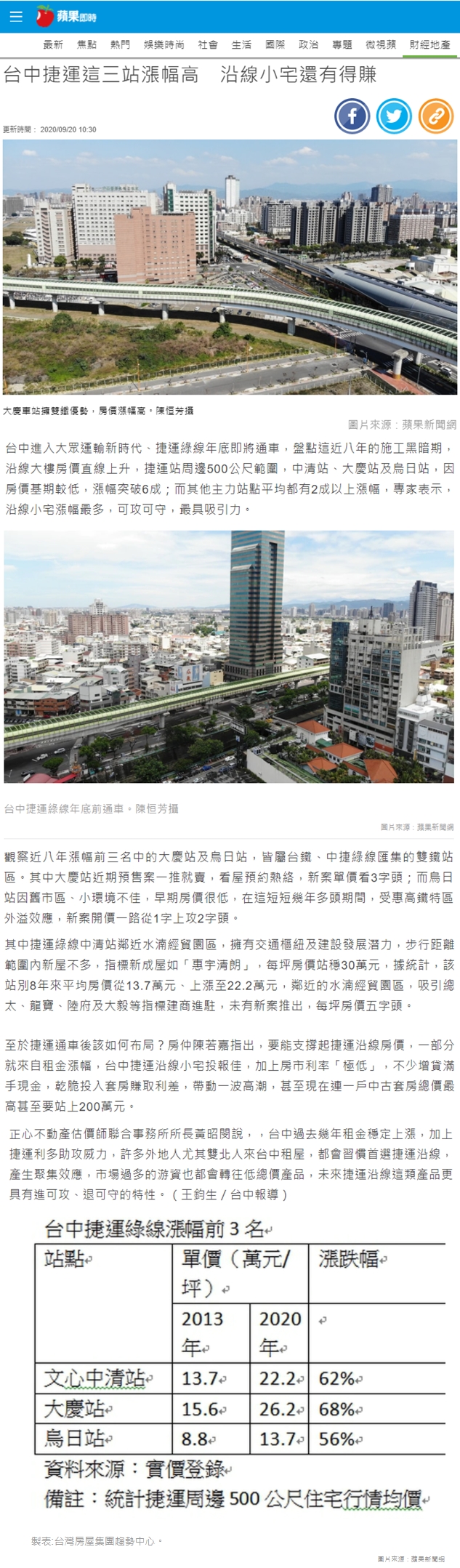台中進入大眾運輸新時代、捷運綠線年底即將通車,盤點這近八年的施工黑暗期,沿線大樓房價直線上升,捷運站周邊500公尺範圍,中清站、大慶站及烏日站,因房價基期較低,漲幅突破6成;而其他主力站點平均都有2成以上漲幅,專家表示,沿線小宅漲幅最多,可攻可守,最具吸引力。