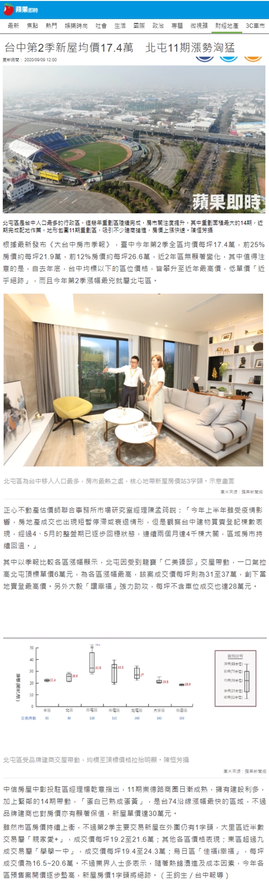 其中以季報比較各區漲幅顯示,北屯因受到龍寶「仁美臻邸」交屋帶動,一口氣拉高北屯頂標單價6萬元,為各區漲幅最高,該案成交價每坪則為31至37萬,創下當地實登最高價。另外大毅「讚幸福」強力助攻,每坪不含車位成交也達28萬元。
