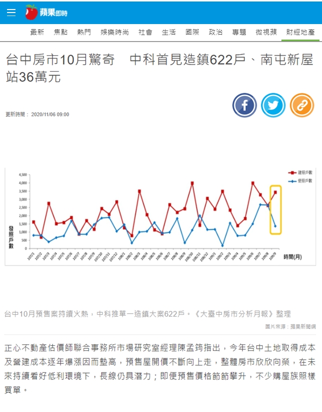 台中10月買賣登記棟數達4957棟,已連續4個月達4千棟門檻,近半年來呈逐月上揚,比去年同期增加8.6%,量價俱揚,其中南屯區新屋近七成交易屬興富發「博識」、惠宇「一森青」交屋潮,帶動當月全區新屋價突破每坪36萬。業者表示,雖然上半年房市買氣受疫情干擾稍有停滯,但觀察近期的交易量已連續6個月正成長,市場熱度持續走高,尤其預售市場靠著低單價、輕鬆付款優勢,市況更為熱鬧,中科更有預售大案622戶將推出。