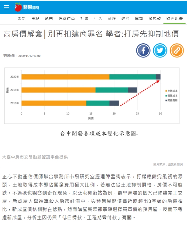 價高漲,購屋族苦叫連連,年輕人更是望屋興嘆,進不了場只能期待著房價下跌。建商蓋房支出就是土地成本、營建成本、間接成本三種,其中最大成本就是土地,以台中為例,成本從2016年的2字頭,至今已經敲響3字頭大門;專家認為若無法從土地抑制價格,房價不可能跌。