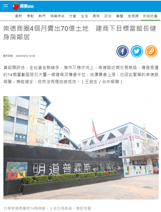 黃昭閔評估,全台資金熱錢多、房市又穩步向上,崇德路近期交易熱絡,應是旁邊的14期重劃區吸引大量一線建商及傳產卡位,地價暴衝上漲,也因此緊鄰的崇德路商圈,機能健全,自然沒有理由被低估。