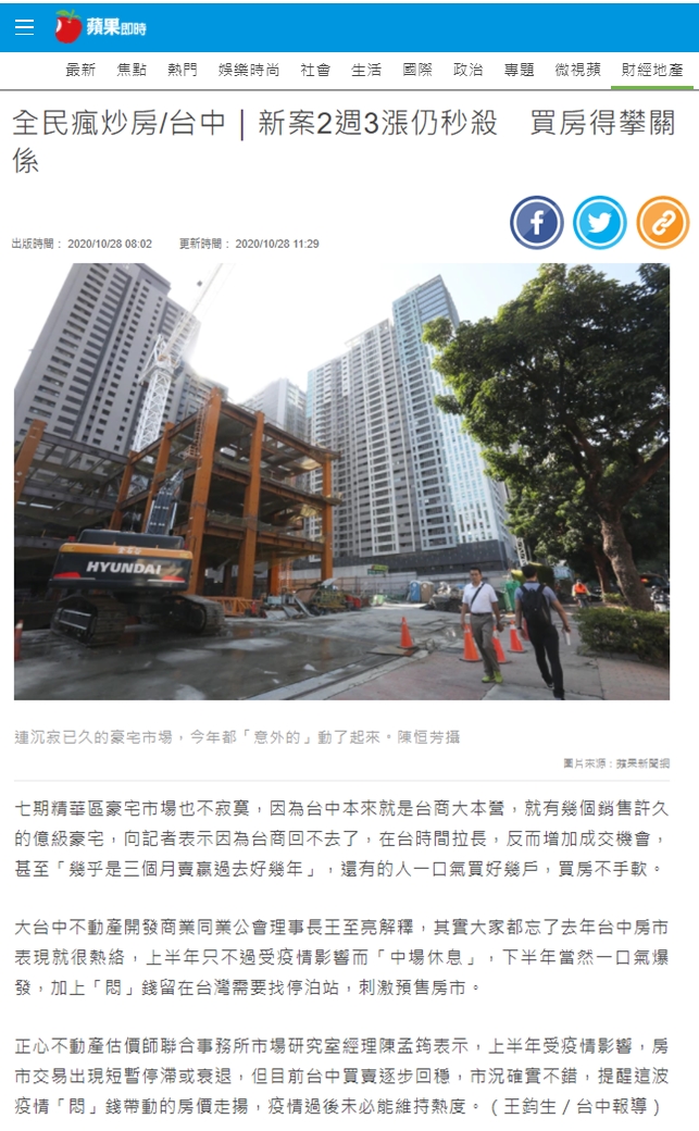 大台中不動產開發商業同業公會理事長王至亮解釋,其實大家都忘了去年台中房市表現就很熱絡,上半年只不過受疫情影響而「中場休息」,下半年當然一口氣爆發,加上「悶」錢留在台灣需要找停泊站,刺激預售房市。