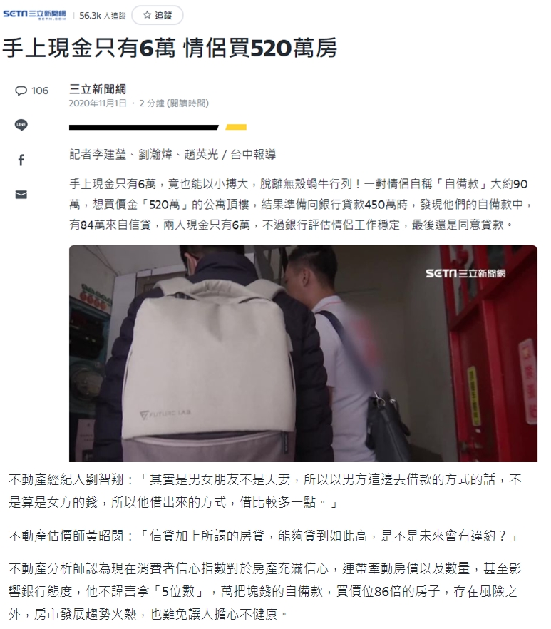 自備6萬就脫離無殼蝸牛行列,這是一對情侶,自稱「自備款」大約90萬,後來決定買下價金「520萬」的公寓頂樓,房仲評估需要向銀行貸款450萬,過程中又發現他們的自備款其中84萬來自信用貸款,實際上兩人手頭上的現金只有6萬,不過銀行評估買方月薪4萬多,加上工作穩定,最後同意貸款。