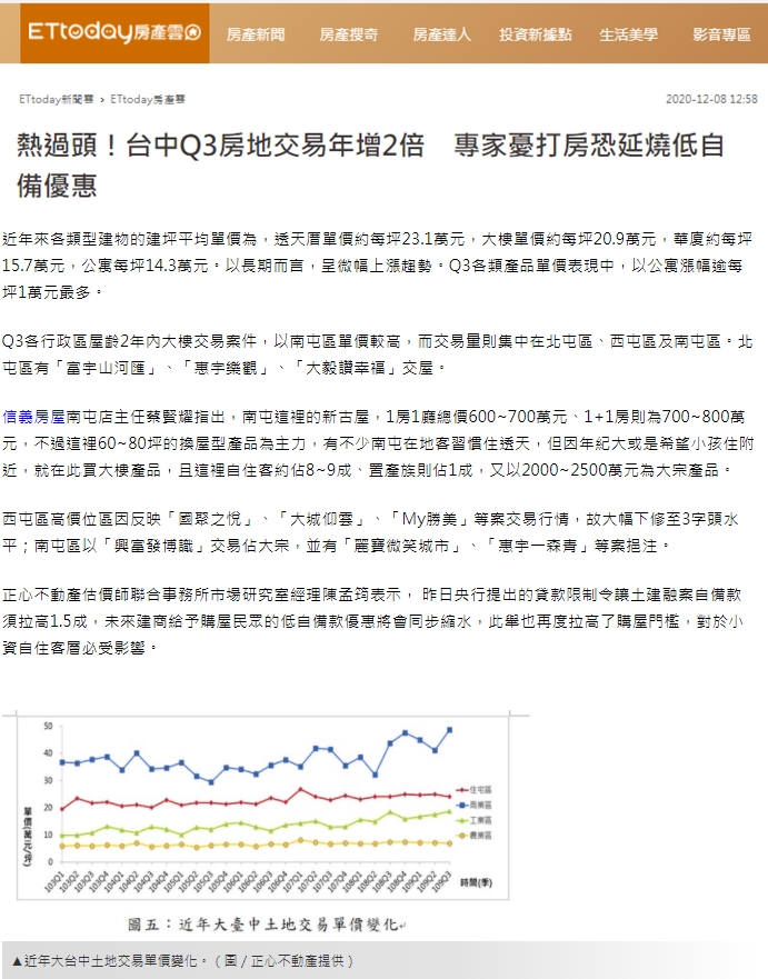 「大台中房市交易動態資訊平台」發布2020年Q3大台中房市分析季報,台中成交金額為3613億元,季增2.3倍、年增2.14倍;成交量為23207件,季增2.17倍、年增1.9倍。房屋與土地的成交總金額貢獻度分別為60%、40%,較上一季分別成長2.38倍、2.19倍,呈現房屋及土地交易齊漲狀態。