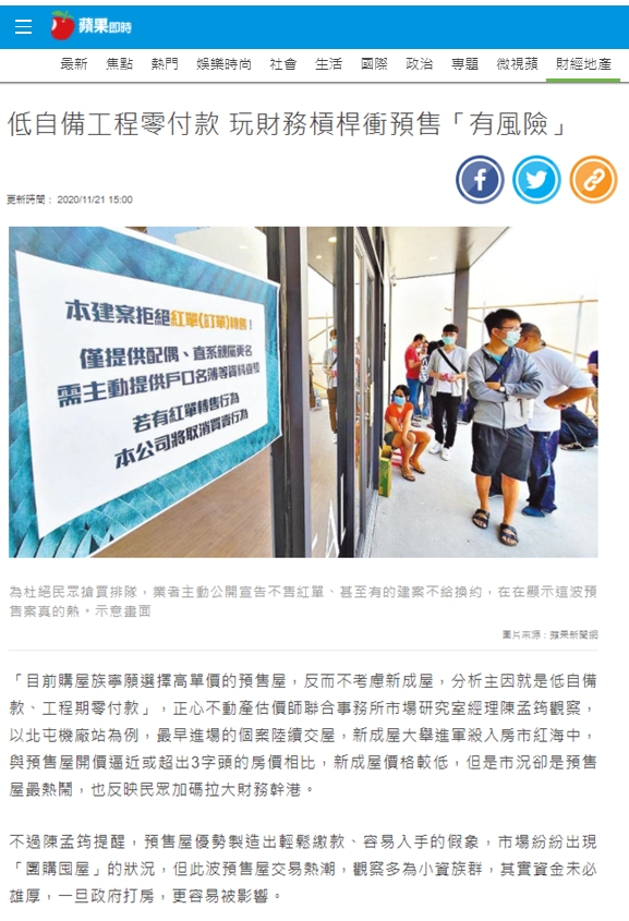 不過陳孟筠提醒,預售屋優勢製造出輕鬆繳款、容易入手的假象,市場紛紛出現「團購囤屋」的狀況,但此波預售屋交易熱潮,觀察多為小資族群,其實資金未必雄厚,一旦政府打房,更容易被影響。